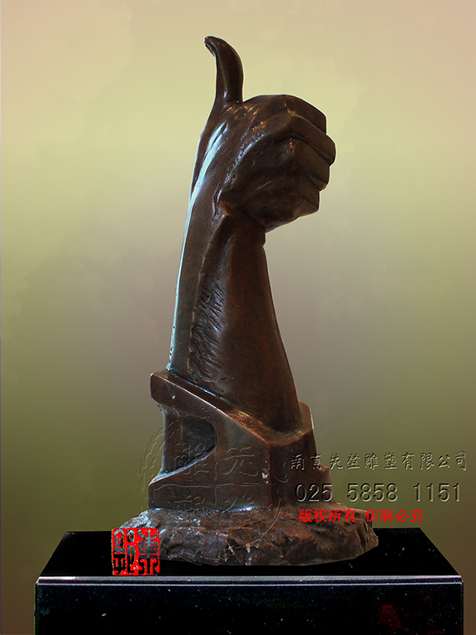 若要用一個詞來形容眼前的雕塑,莫過于“芝華士”了,沿用克里斯汀·拉科魯瓦對芝華士的評價“在我看來,有些名字,哪怕只是聽人提起或在書中偶遇,就會不自覺地將其與'聲名顯赫'聯系起來,因為這些名字本身就代表著一種品質、一種權威或者一種奢華氣質。對我而言,'芝華士'這三個字就是'時尚'、'奢華'、'尊貴'的代名詞。”一種酒何以用“奢侈”、“最貴”、“時尚”來形容?路人皆知,喝芝華士是一種享受,將酒提升為藝術,由內而外的品鑒,是一種邊緣文化潮流化,這一切不僅源于調酒師Colin Scott以及精湛絕倫的技術,而且他擁有世界頂級設計師克里斯汀·拉科魯瓦、亞歷山大•麥克奎恩。然而一尊雕塑,何以用一種酒來代稱?其實不然,芝華士的定義早已并非一樽酒而已,芝華士,享有世界蘇格蘭高級威士忌,他是外在與內在的統一,誠如雕塑所塑造的舉起的大拇指,同等的是一種邊緣文化,她需要人們鑒賞品位,需要足夠的情趣與審美素質。如同芝華士所代表的“時尚”“豪華”“尊貴”,雕塑依然具有最豪華的陣容,華麗端莊的金箔,剛毅的輪廓,以及人類機理特征所表現的自然之美,他是藝術家獨具匠心的杰作,是一樽東方的皇室威士忌,享有與芝華士同樣的尊榮。用它來界定雕塑,而且是眼前獨具匠心的雕塑,是源于其洗凈鉛華般的唯美設計風格以及其醇和出眾的口感,如雕塑從內而外,周身所散發出的氣質。